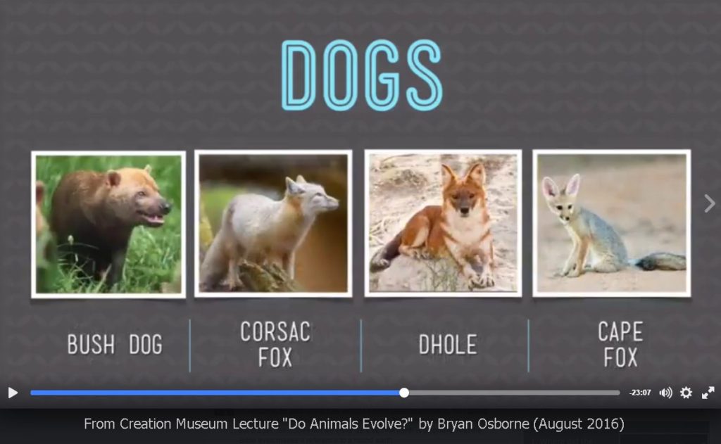 Arter som ingår i ”hundsorten” enligt Answers in Genesis. Skogshund (Speothos venaticus), korsakräv/stäppräv (Vulpes corsac), asiatisk vildhund (Cuon alpinus) och kamaräv (Vulpes chama). Alla räv-, varg- och hundar tycks ingå så att sorten närmast verkar motsvara normalbiologins familj Canidae, hunddjur.